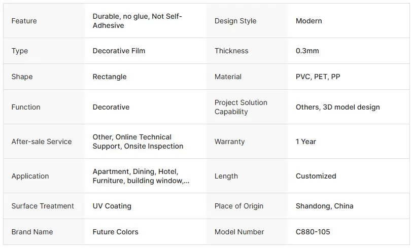 2.Cost-Eraginkortasuna: dekorazio efektu berdinarekin, kostu osoa (materialaren kostua gehi prozesatzeko kostua) kolore sendoaren film modernoaren kostua baino askoz txikiagoa da. Gainera, 8-15 urte bitarteko zerbitzua du. "Kalitate handiko dekorazioa kostu baxuan" lortzeko aukera hobetsia bihurtuz.